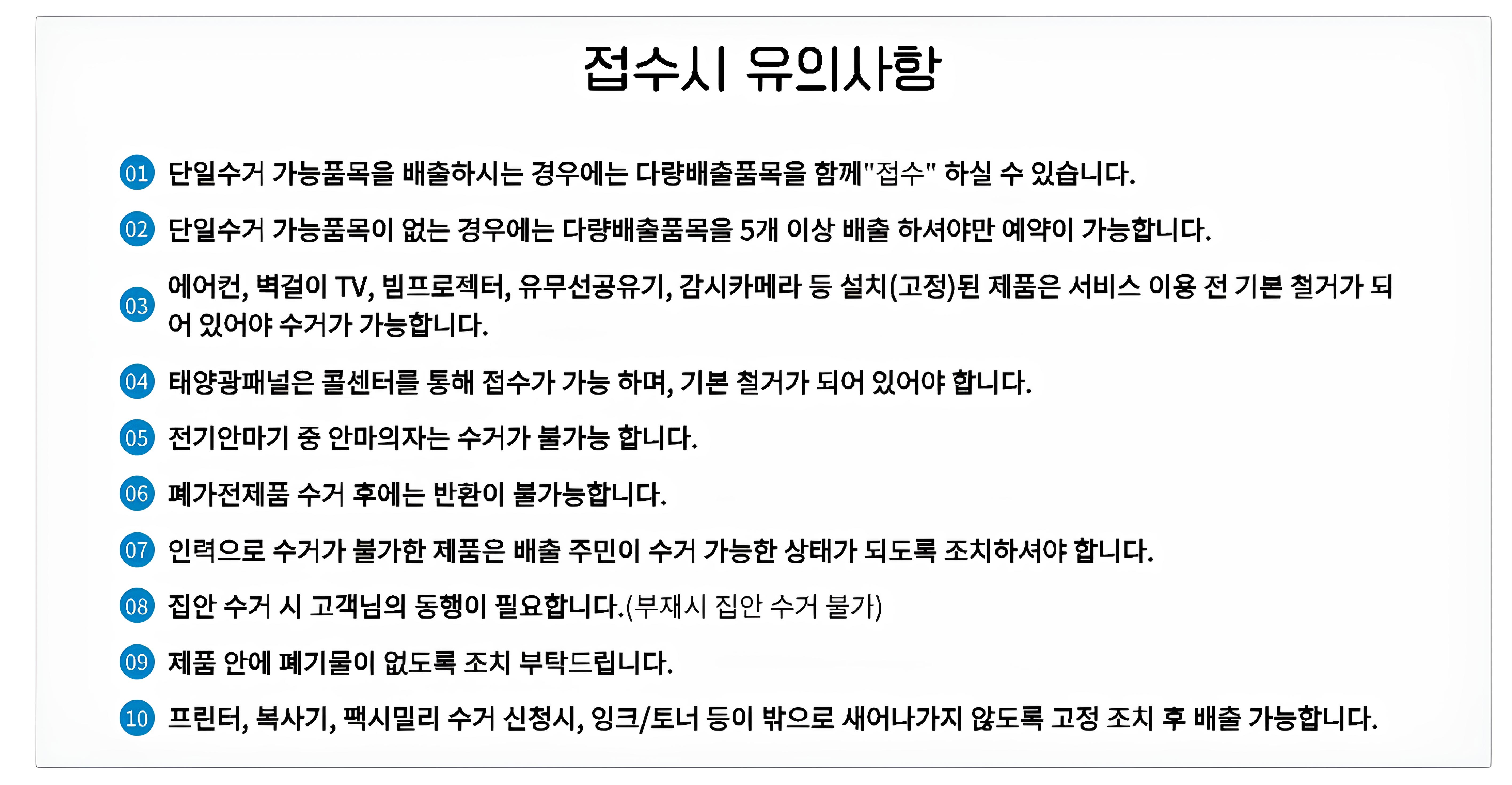 주의할 점은 에어컨이나 벽걸이 TV와 같이 고정되어 있는 제품은 미리 철거가 되어 있어야 하며, 사다리차나 크레인이 필요한 대형 제품, 제품을 분해해야만 수거가 가능한 경우에는 미리 수거 가능한 상태로 조치를 해놓아야 합니다.