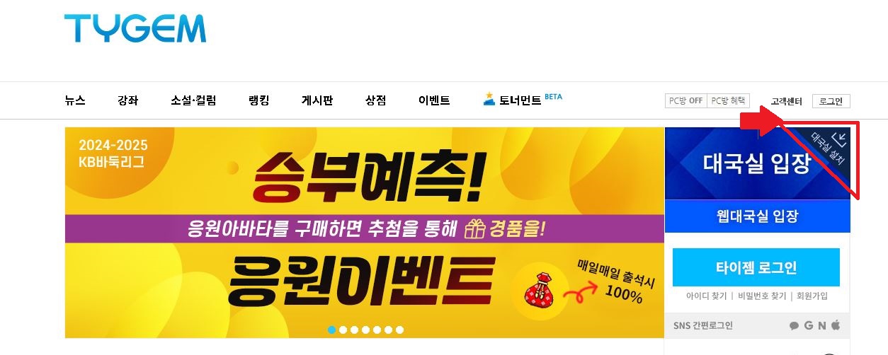 ▶️ 타이젬바둑 공식 웹사이트에 들어가면 메인 화면에서 '대국실 다운로드' 버튼을 찾을 수 있습니다.