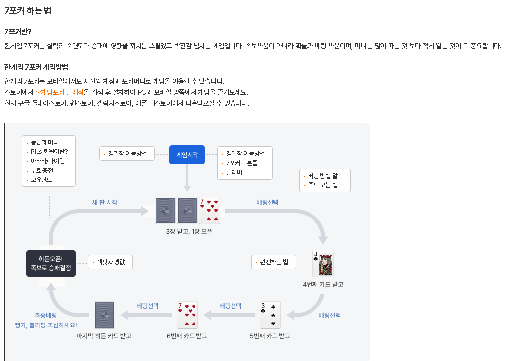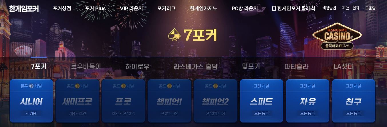 ☑️7 포커 : 가장 기본적인 포커 모드로, 7장의 카드를 사용하여 족보를 만들어 승부를 겨룹니다.
