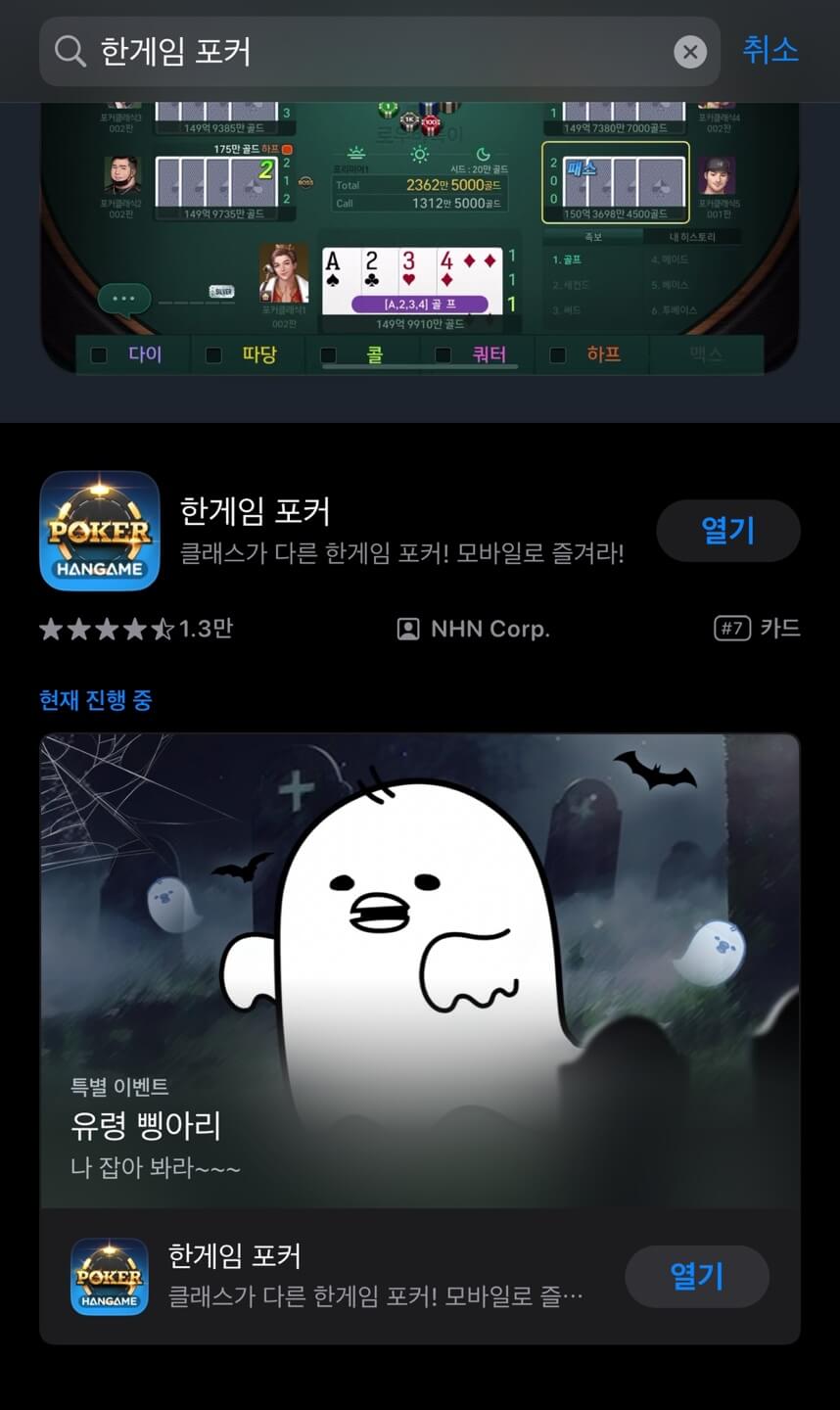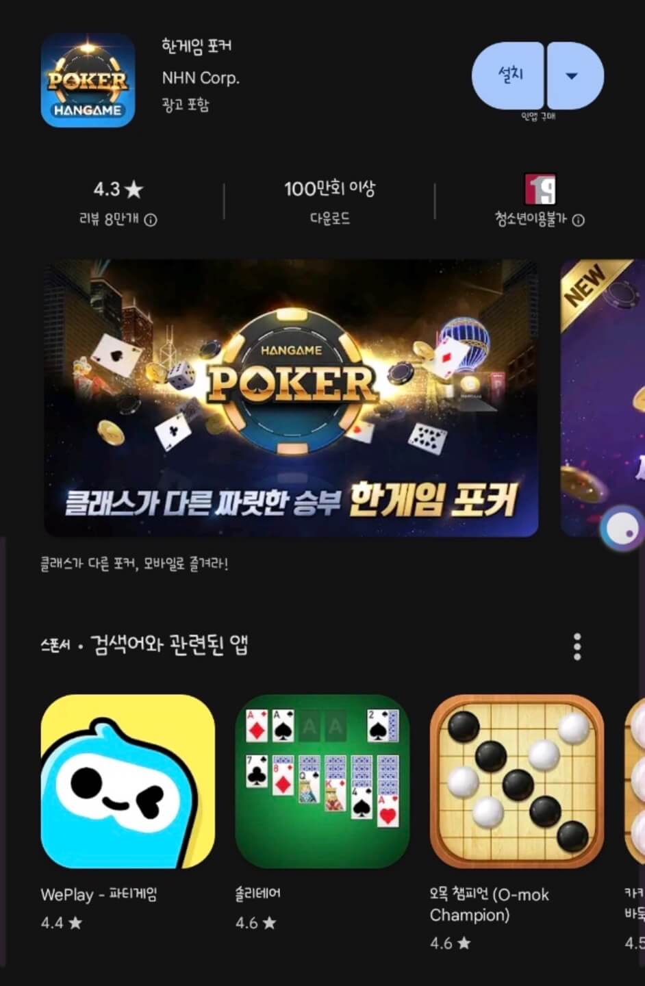 ✔️ 설치 - 검색결과 한게임포커 선택 후 설치 버튼을 클릭합니다.