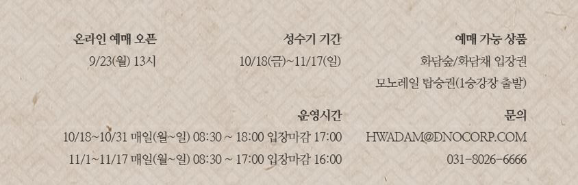 ✅ 화담숲 성수기 기간 - 2024년 10월 18일(금) ~ 2024년 11월 17일(일)