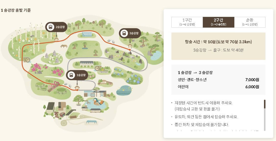 모노레일은 노약자의 편리하고 안전한 관람을 위해 화담숲 서쪽 이끼원~화담숲 정상~분재원 사이를 지나는 1,213m 순환선으로 전체 운행 소요시간은 약 20분입니다.