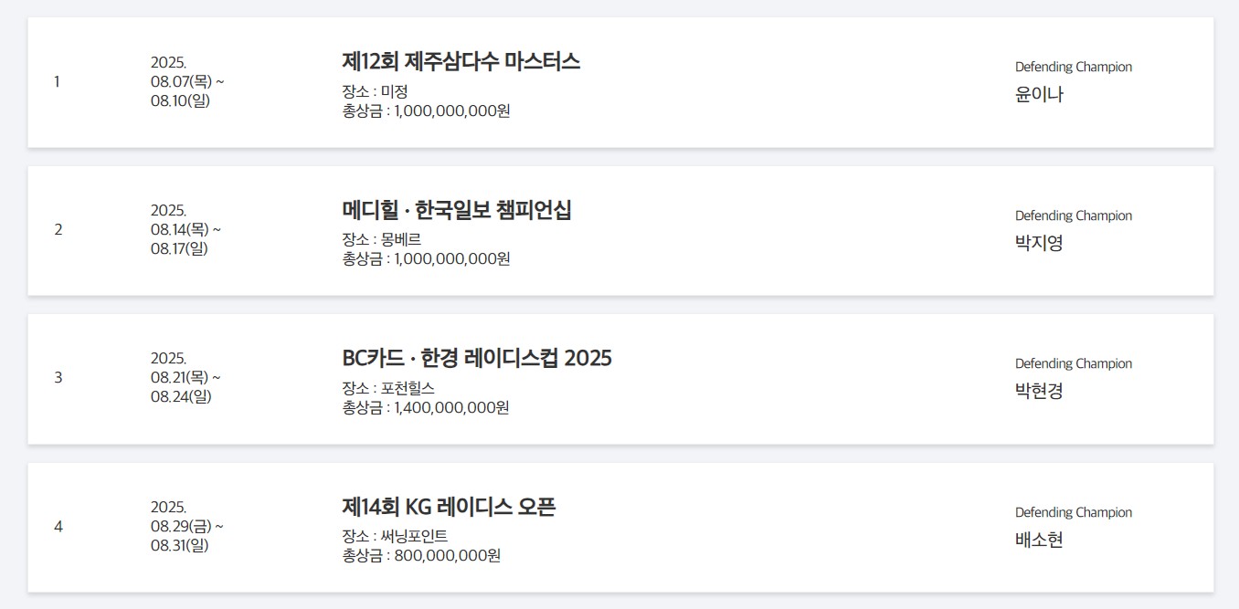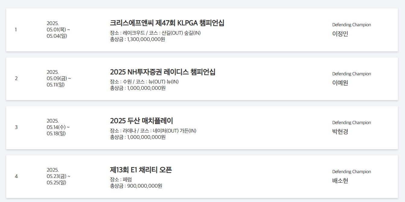 자 그럼 이번에는 2025KLPGA대회일정과 주요 특징, 그리고 대회별 세부 내용을 소개하겠습니다.