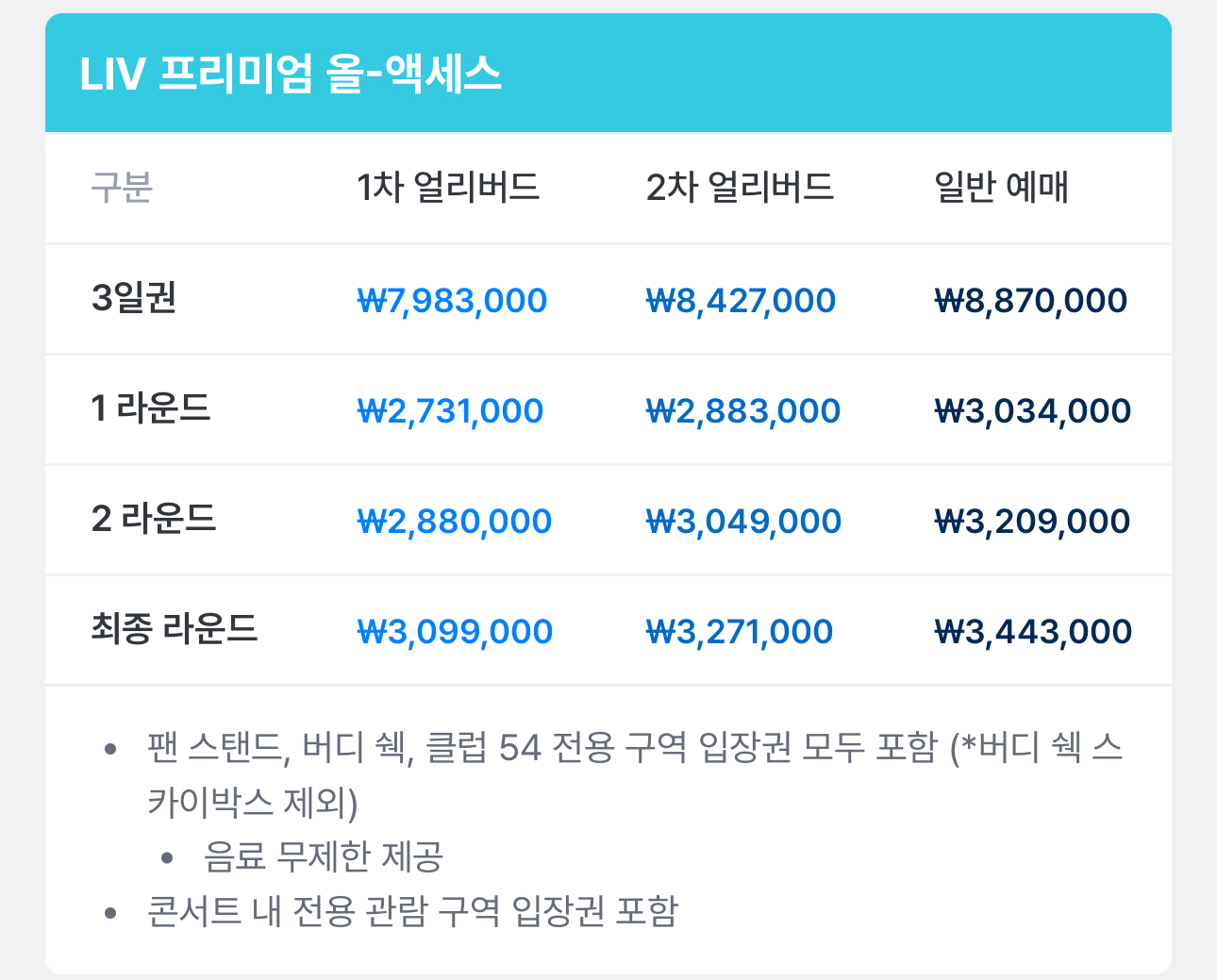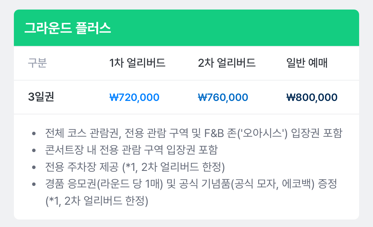 ■ 그라운드 플러스: 추가 혜택과 함께 한정 수량으로 제공되며, 전용 구역에서 경기 및 이벤트를 관람할 수 있습니다. 얼리버드 구매자에 한해 전용 주차장 이용 가능.