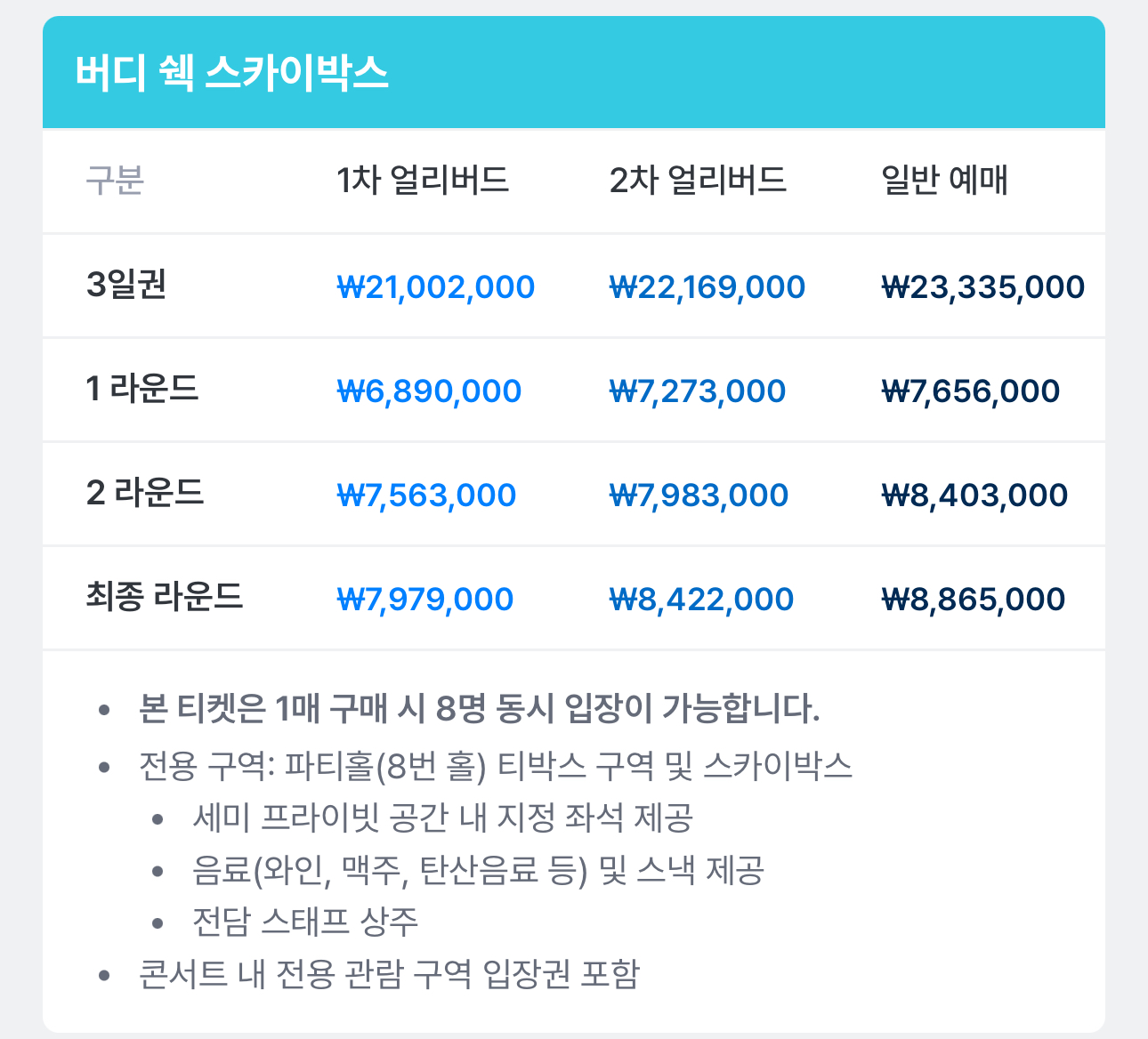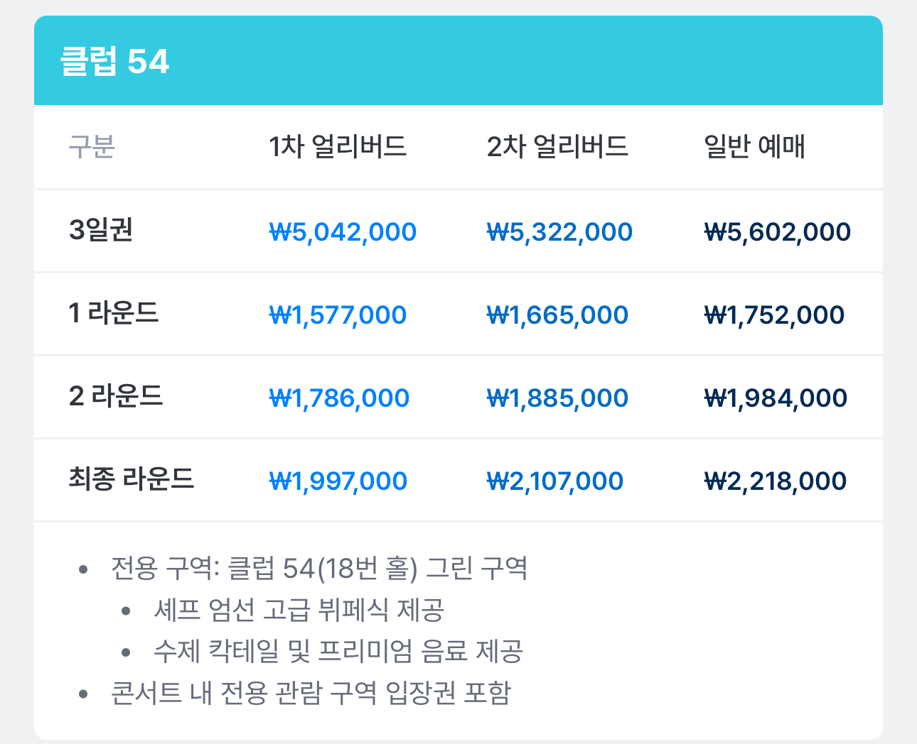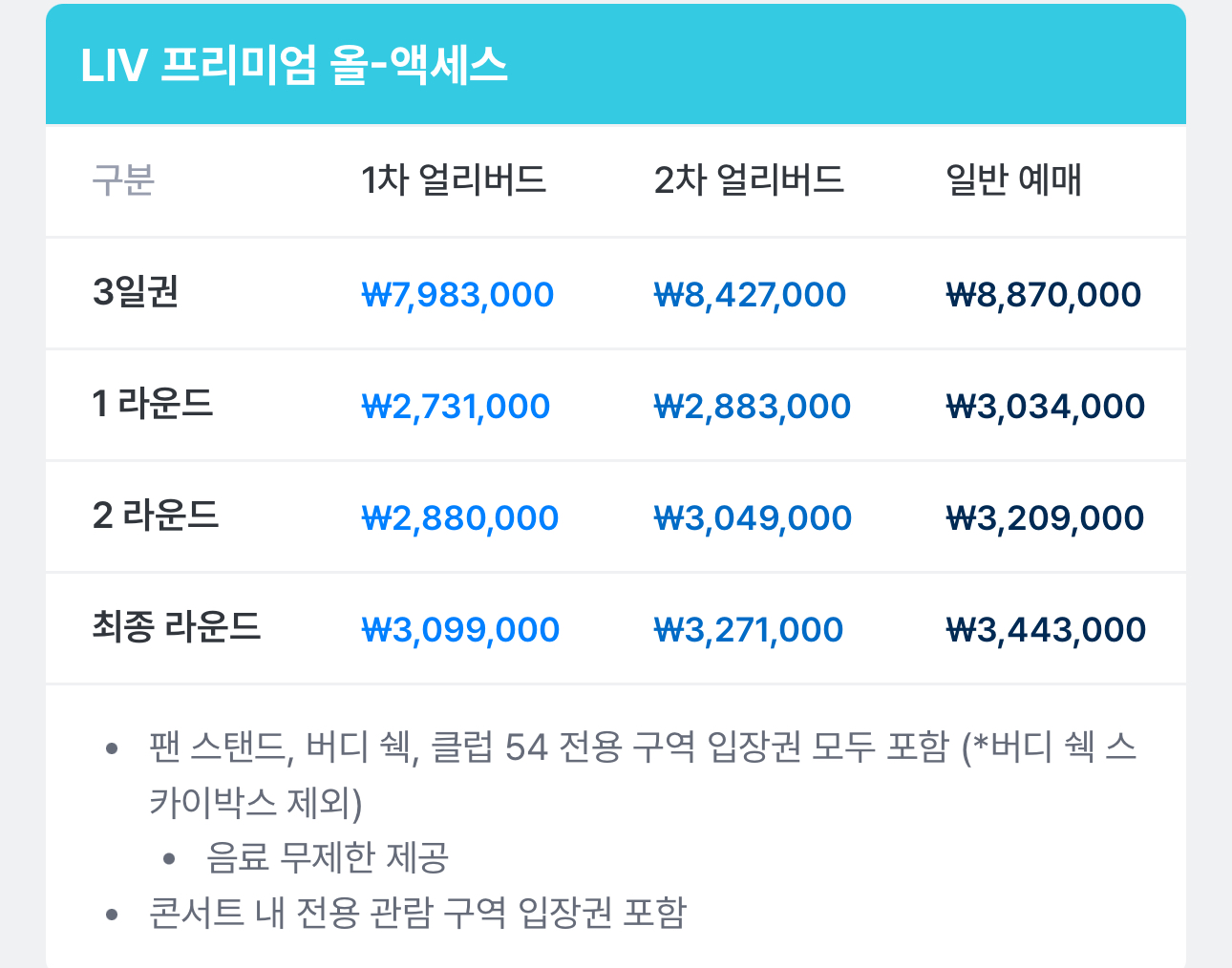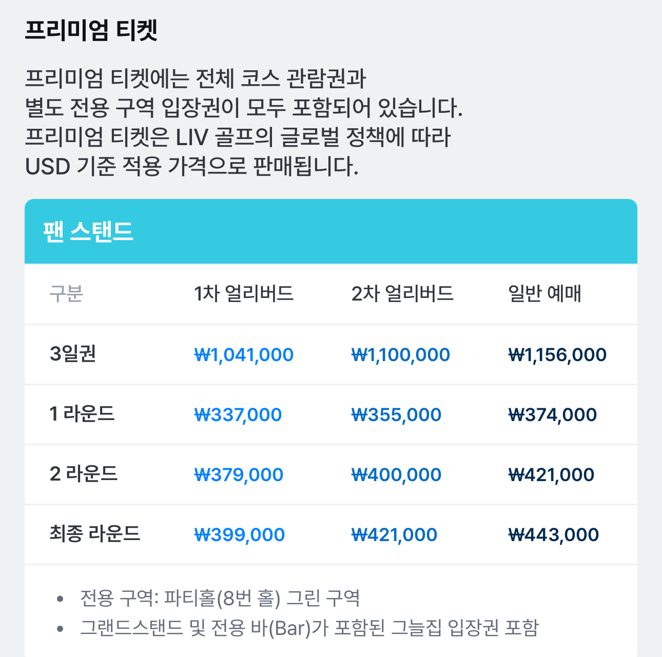 ■ 프리미엄 티켓: 주요 홀에서 LIV 골프의 색다른 골프 관람 환경을 즐길 수 있습니다.