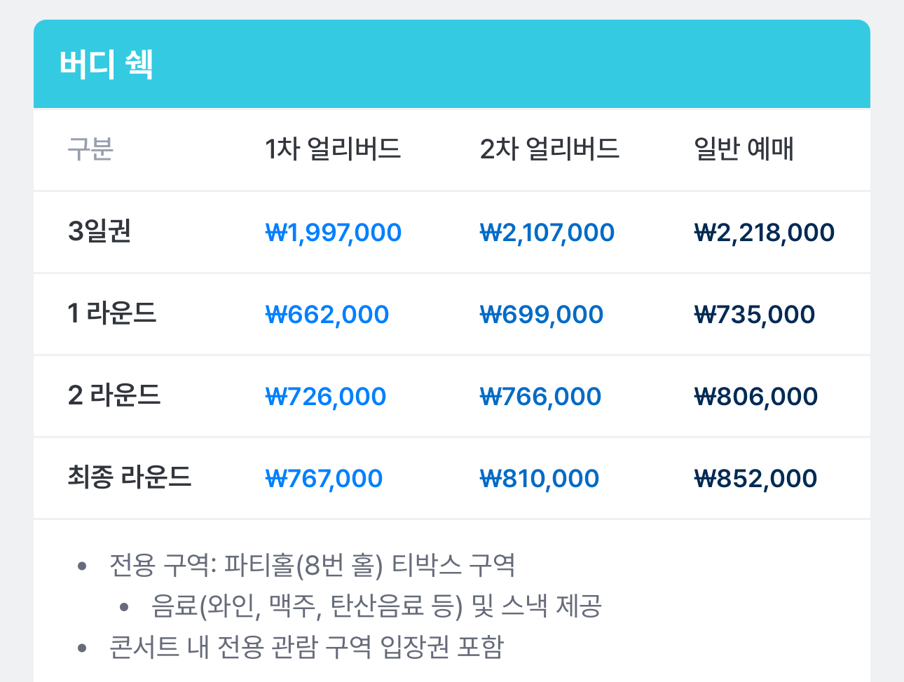 쿠팡플레이에서 LIV 골프 코리아 대회 입장권을 판매합니다. 예매는 2025년 3월 19일 오후 8시부터 시작되며, 1차 얼리버드 예매로 모든 티켓에 10% 할인이 적용됩니다. 2차는 5% 할인이 적용될 예정이며, 티켓은 다음과 같은 혜택을 제공합니다: